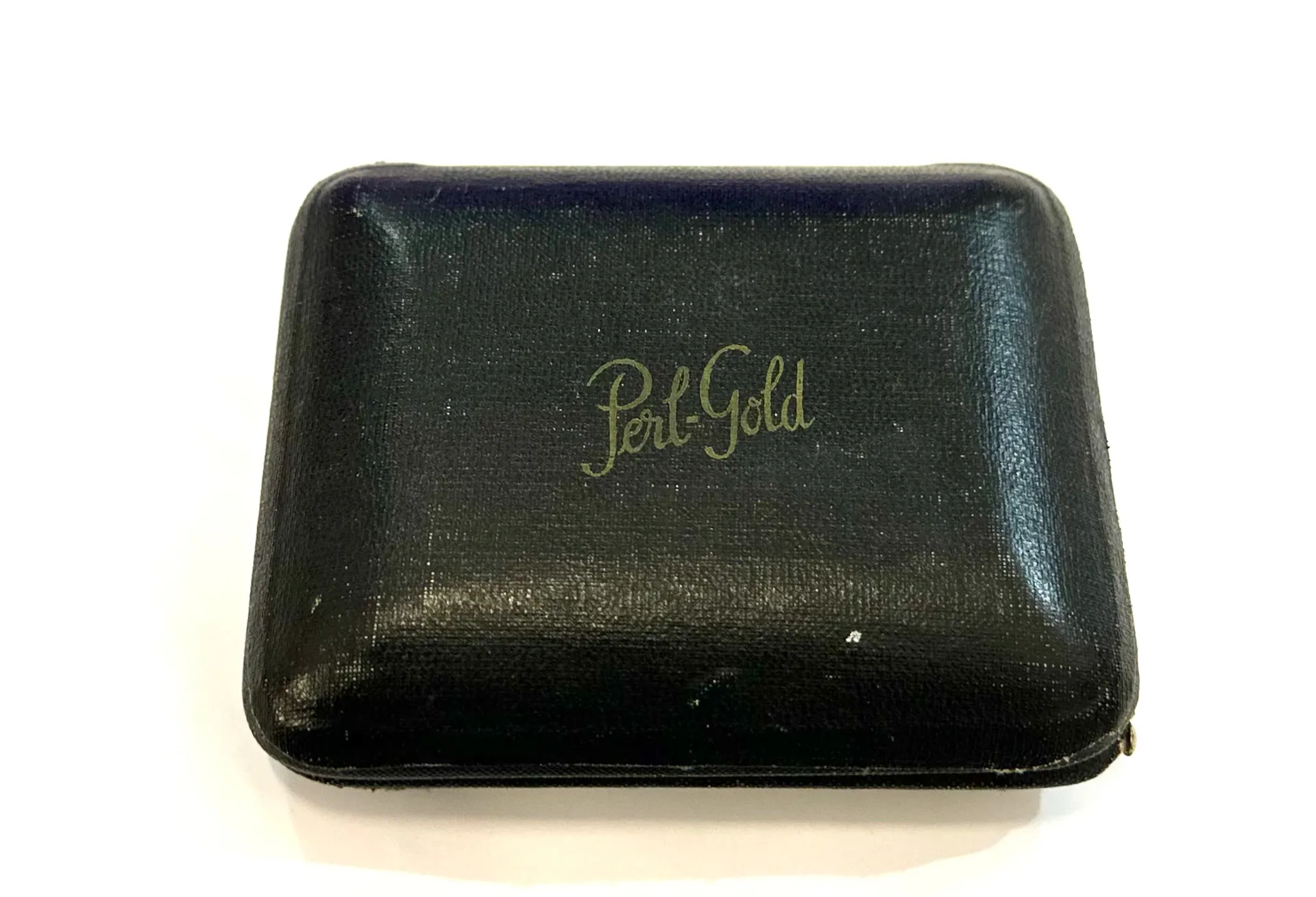 Perl-Gold branded Bb Clarinet reed case, leather bound with fabric interior and glass plates for the reeds. Has a metal pin into catch closing mechanism.