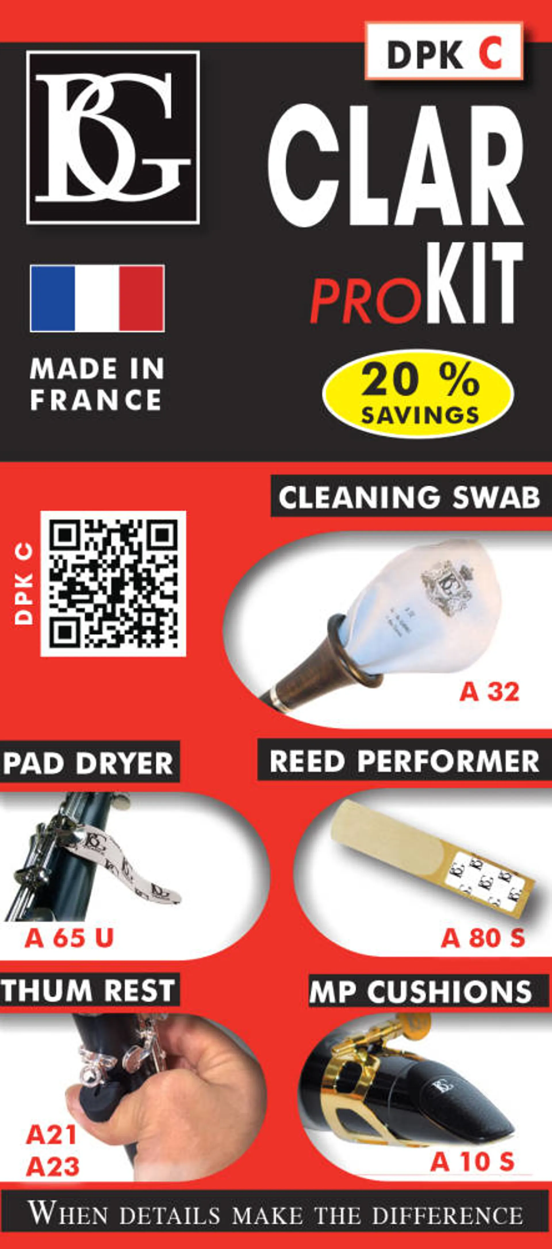 The useful BG DPKC Clarinet Pro Kit pack contains everything you need to keep your Clarinet in tip-top condition. It includes, the BG A32, the BG A65U, 2 x BG A10s, a BG A21, a BG A23 and a BG A80S.